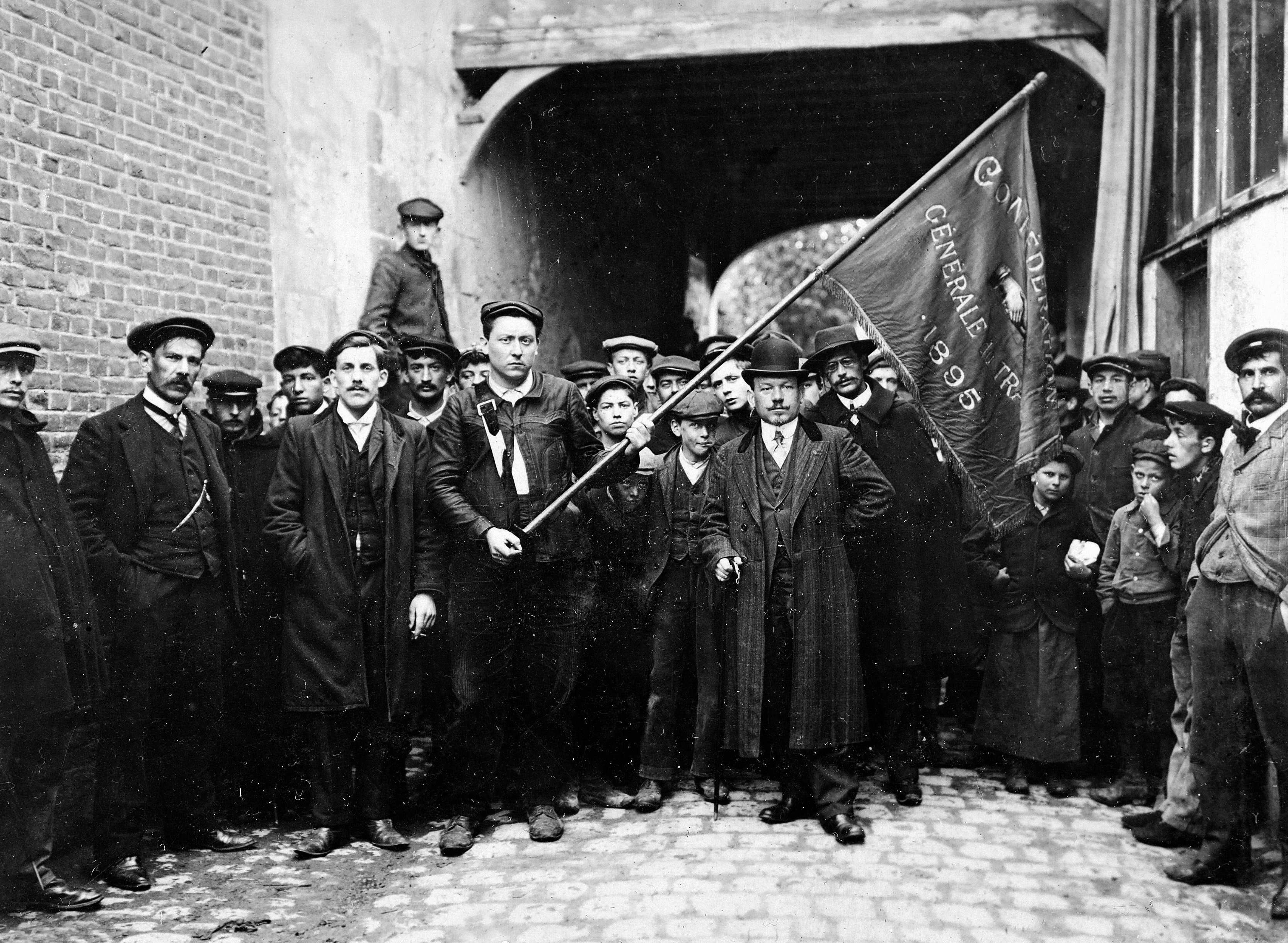 Εργάτες κατασκευής κουμπιών διαδηλώνουν στη Μερού κρατώντας σημαία της ναυτιλιακής Γενικής Υπερατλαντικής Εταιρείας (CGT), στη Γαλλία το 1909